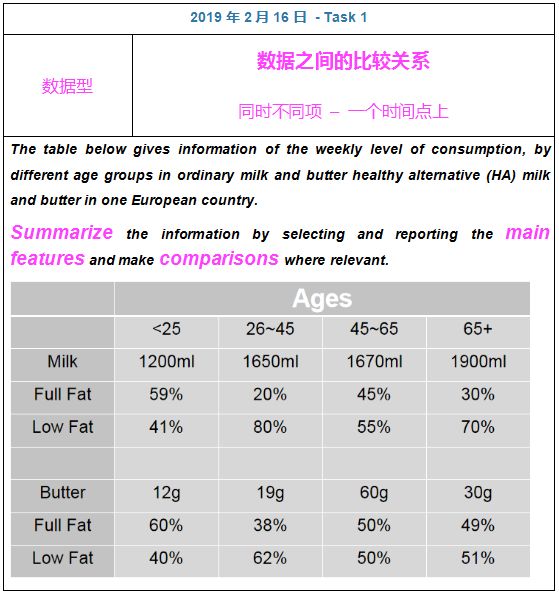 Different from the other two age groups, [← 这个形容词短语引导的状语暗示了这两个组里的区别不大] the age groups of 26 to 45 and 65 and older are where the consumption of full-fat milk and that of low-fat milk areimmensely different. The respective disparities are 20 percent to 80 percent and 30 percent to 70 percent. Meanwhile, the older is an individual, [主系表时的倒装现象] the more milk the individual drinks, andpeople under 25 years of age drink obviously less, and the oldest group drinks obviously more.