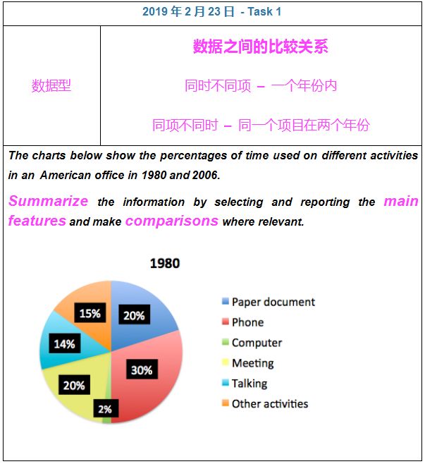 In 1980, [理解数据背后的事实,而不要直接呈现数据:] the staff were most occupied with (be occupied with) making phone calls,as they spent 30 percent of their time on it. Meanwhile, [理解数据背后的事实,而不要直接呈现数据:] computers did not use much of their time, and the percentage was a mere 2. [不要罗列数据,加工一下:] The remaining 68 percent of the staff’s work hours were roughly evenly allocated to the other 4 tasks – doing paperwork, meetings, talking and miscellaneous activities.