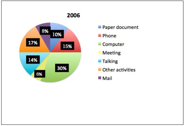 The pies are an illustration of how time was allotted to (be allotted to) different tasks in an American office in 1980 and 2006.