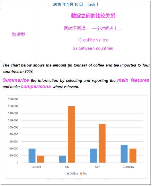 First, the UK and the US stood out (stand out), as their import of tea – 160,000 tons and 110,000 tons respectively – was multiple times of their import of coffee – 20,000 tons and 40,000 tons respectively. Meanwhile, tea imports in these two countries was multiple times of the tea imports in Canada and Germany, which were coincidentally 20,000 tons and 40,000 tons too. Second,Canada and Germany imported more coffee than tea. In Canada,coffee was twice as much as tea, and in Germany, tea was slightly less than coffee.