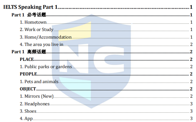 常考话题也有地点类话题的Public parks or gardens;事物类话题的Mirrors, Headphones, Shoes, APP;以及事件类话题的Dreams, . Emails, Science等等。