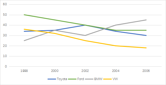 By contrast, the remaining three companies, Toyota, Ford and VW, all improved the efficiency in car manufacturing, represented by several declines in the manufacturing time. To specify, similar development could be found in both Ford and VW, whose consumption of time dropped consistently from 50 days to 35 days and from 36 days to 18 days respectively before remaining stable between 2004 and 2006. In addition, as for Toyota, although the period of 1998 to 2002 witnessed its 6-day marginal growth, the figure fell to 30 days afterwards, echoing that for Ford between 2002 and 2004.