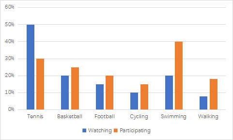 Tennis and swimming both draw immediate attention, as one had the largest viewing figure, attracting 50% of audiences, while the other witnessed the highest participation rate(40%). It is also worth mentioning that tennis was the only sports whose viewing figure had an apparent advantage over the participation rate. Meanwhile, a similar gap of 20% was also observed between the two figures for swimming.