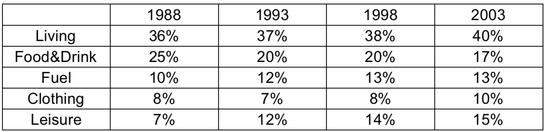 Depicted in the table is how the families in the UK allocated their money for five specific purposes in four separate years: 1988, 1993, 1998 and 2003.
