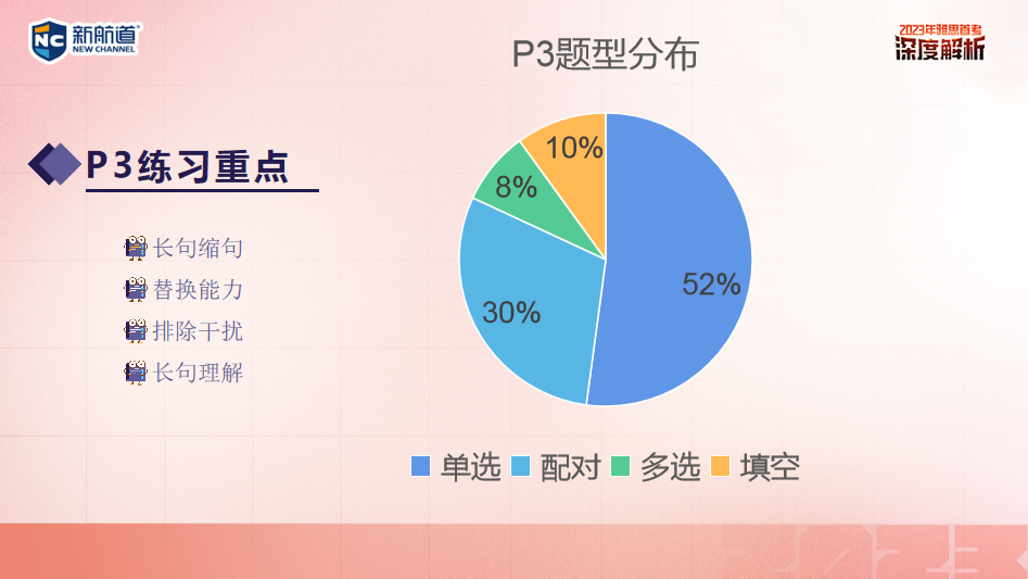 part 3整体比率最高的是单选题,但是选项较长,涉及到长句缩句。因此需要考生掌握将有效信息提炼出来的能力,以及对长句的理解能力。