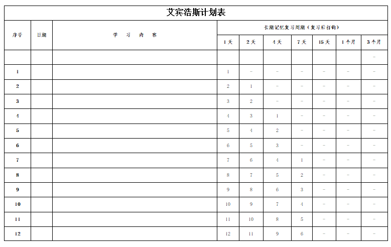 长期记忆复习周期:9号你正在学习内容2,要复习内容1;10号正在学习3,要复习内容2,1;11号正在学习4,要复习内容3,2,1。以此类推使用。
