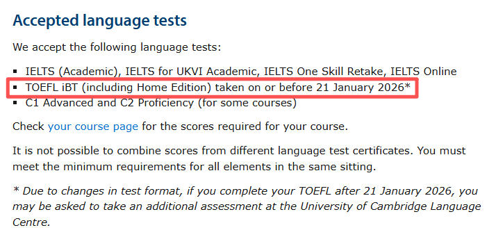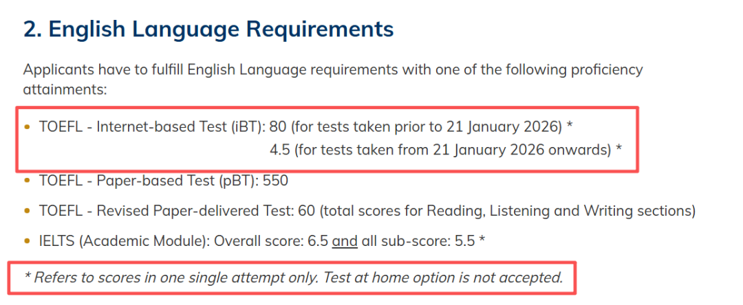 而且港科大的本科和研究生都已经进行更新。研究生:港科大研究生招生要求页已经明确写明,TOEFL iBT为80(2026/1/21前)或4.5(2026/1/21起);同时注明at-home版本不接受。也不接受拼分。