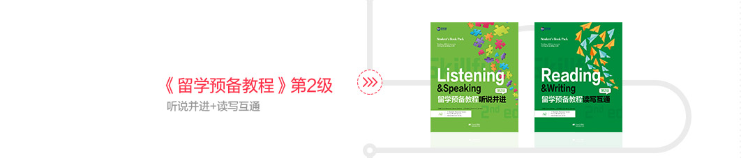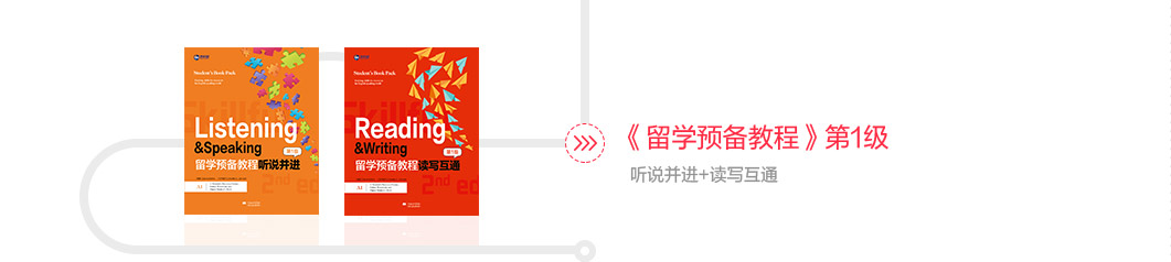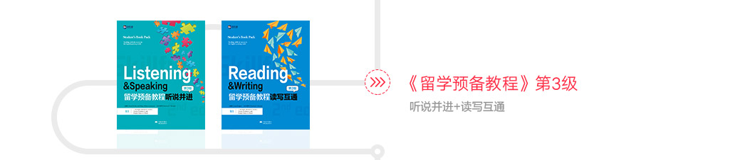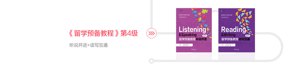 留学预备课程尊重语言学习规律:听说并进、读写互通,课程共包含四个级别,每一级别均配备听力及口语、阅读及写作教程。全面改善学生听说读写英语技能。