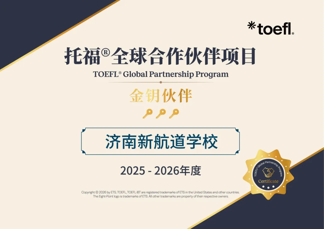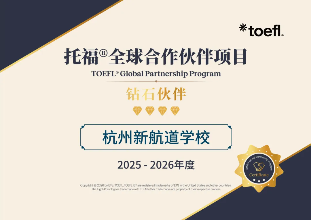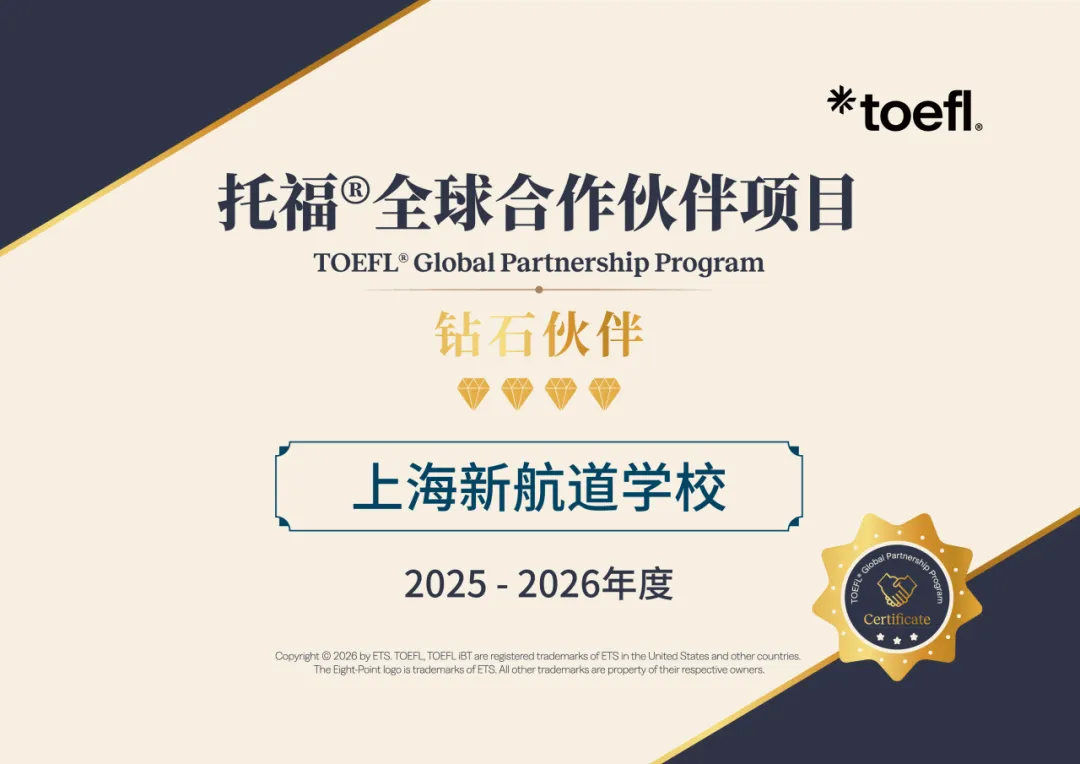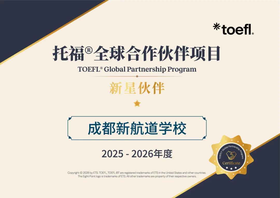 新航道国际教育集团一直以来与ETS保持密切合作,在托福联盟项目中获得了显著荣誉:连续六年获授荣誉的合作伙伴奖(2020-2024:“托福联盟项目三星级成员”;2025:“托福全球合作伙伴项目钻石伙伴”),不仅展现了ETS官方对新航道的充分认可,更表明新航道在2025年托福考试培训中做出了杰出贡献。