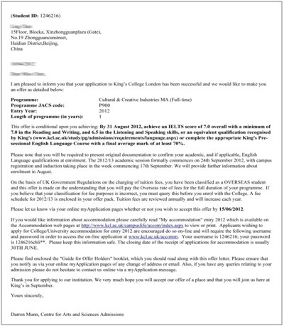 点评:该学生在校是参加相关活动以及毕业后两年编辑工作经验为申请带来很大的帮助,但是其所有的发表文章都只有中文版,因此,我们帮助学生选择了合 适的文章并指导了学生完成发表文章的英文版本,在申请阶段将材料发送给大学相关录取老师,使得学校对学生有全面的了解,最终成功拿到king's的 offer。